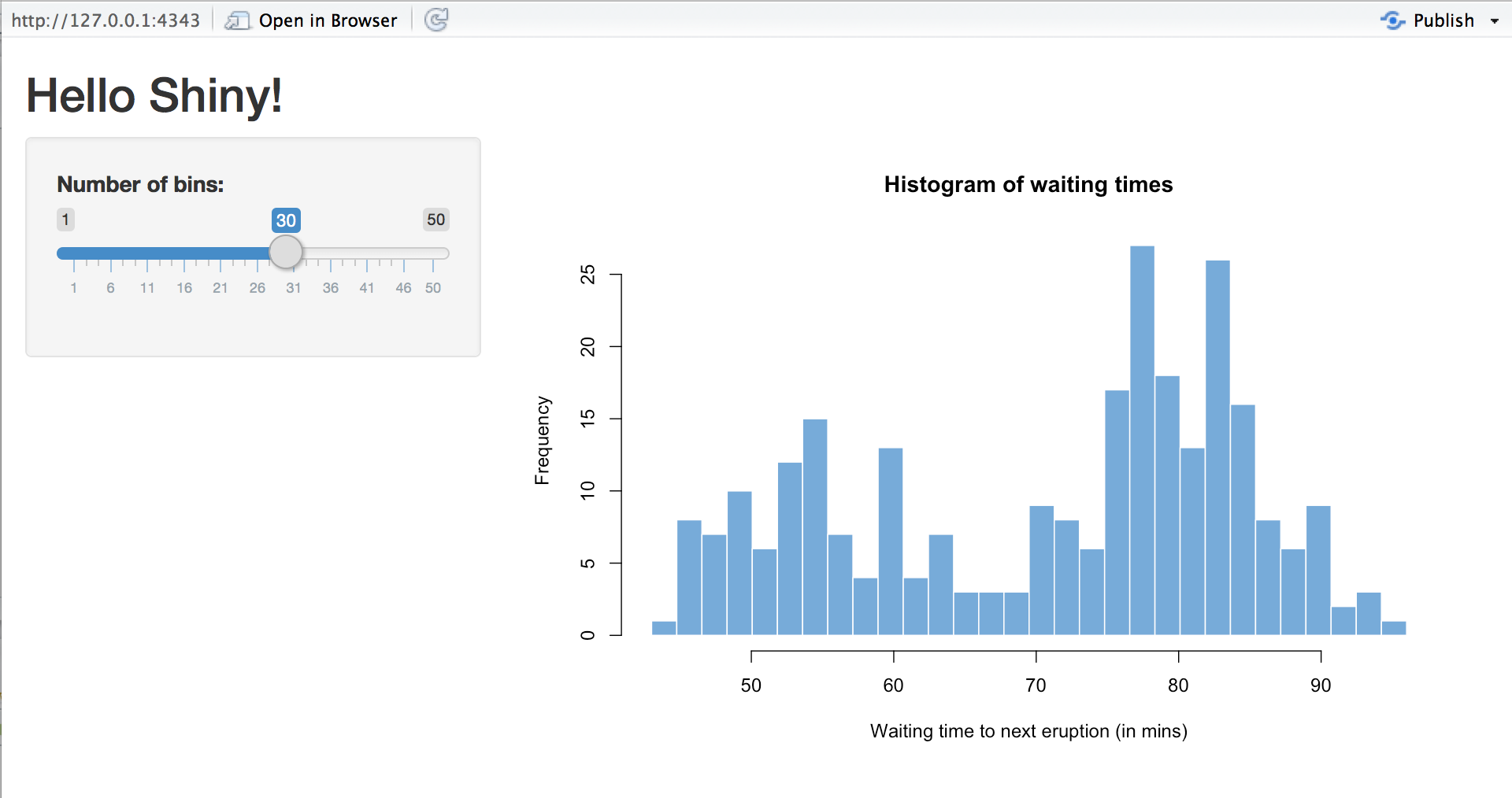 従って、例えば、アプリに 2 つのウィジェットがあり、1つは “var”、もう 1 つは “range” であった(これらの名前は、Lesson 3 でウィジェットに付けたものです)とすると、”var” と “range” の値は、input$varと input$range として保存されます。スライダ・ウィジェットには2つの値(min と a max)があるので、input$range には長さ 2 のベクトルが含まれます。