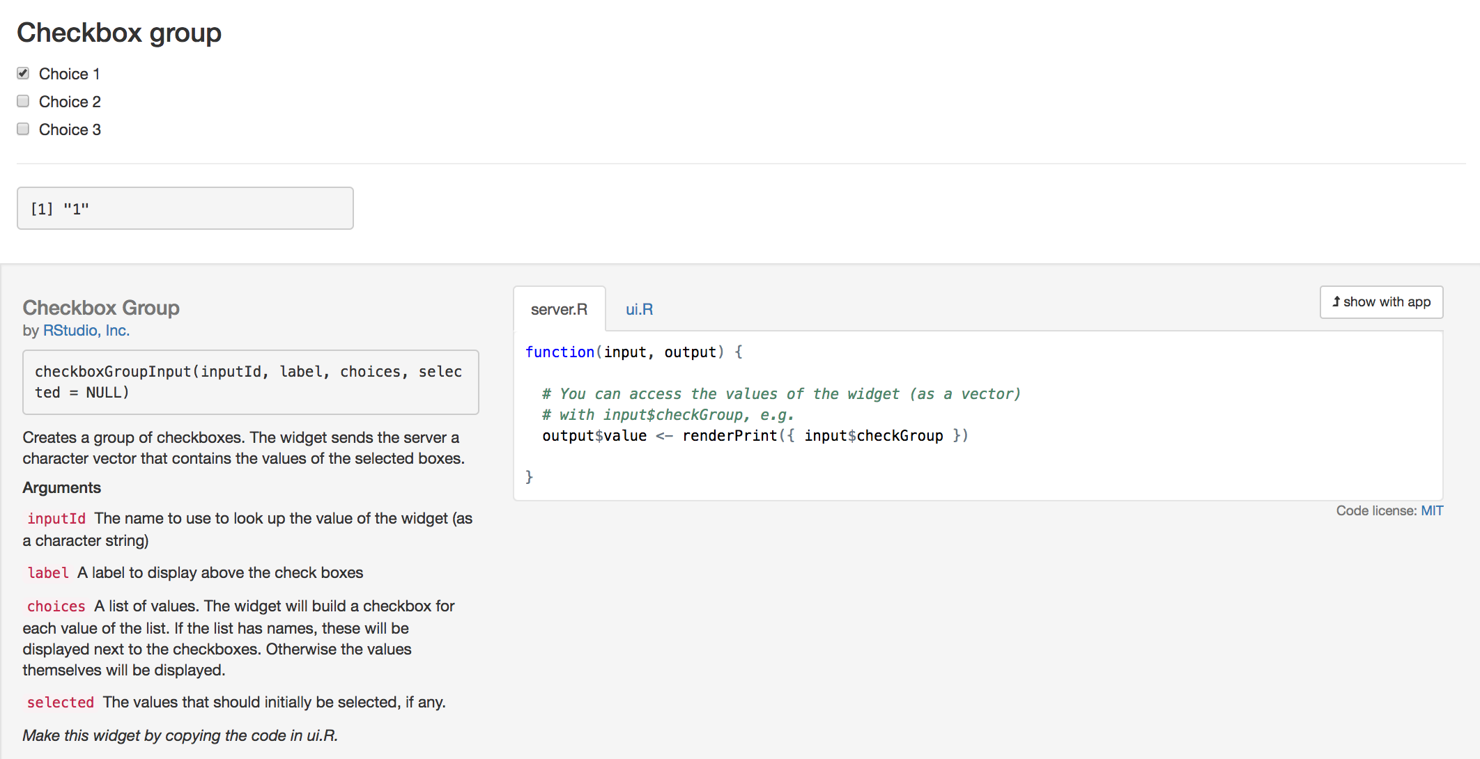 server <- function(input, output) { output$selected_var <- renderText({ paste("You have selected", input$var) }) } |